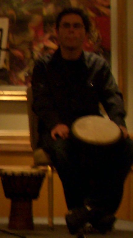 The two drums you see by his side are the insturments of his trade, he also has a business card that reads "Have drum, will travel."